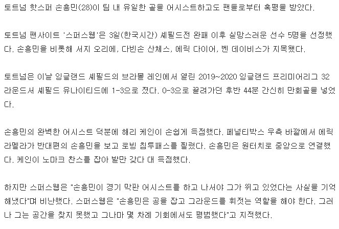 '1도움' 하고도 욕 먹는 손흥민, 스퍼스웹 "존재감 없어" 혹평