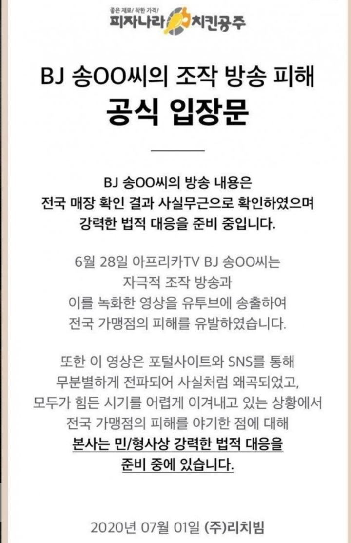 조작 유투버에 대한 피자나라 치킨공주 법적대응 입장문