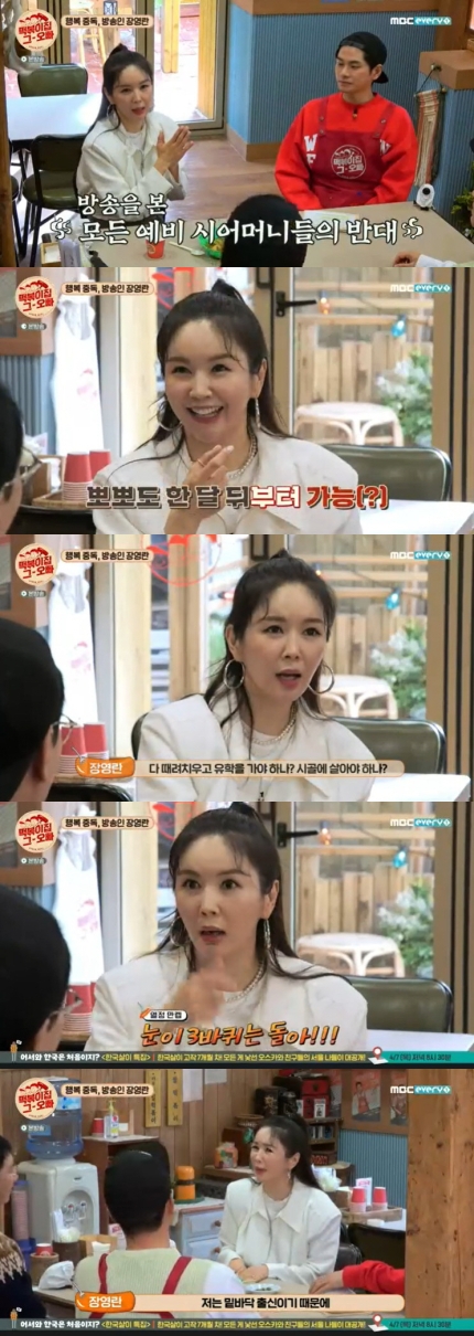 하지만 슬럼프도 있었다. 장영란은 "연애를 못하겠더라. 방송을 보고 모든 어머니들이 저를 반대하니까. 아빠가 많이 속상해했다. 그리고 제가 의외로 보수적"이라며 "제 목표는 행복한 가정을 이루는 건데 이 꿈을 못 이룰 수 있겠구나 싶어서 연예인을 괜히 했구나 싶었다 슬럼프가 심하게 와서 유학을 가야 하나, 시골에 가야 하나까지 생각했다"고 털어놨다.