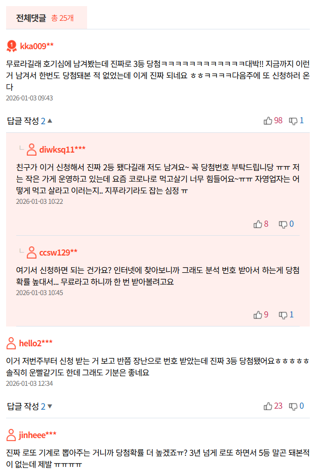 예상번호 배포는 로또 구매가 가능한 대한민국 국적의 성인은 누구나 참여 신청이 가능하나 무더기 당첨을 막고 보다 많은 이들에게 당첨 기회를 제공하기 위해 아래 창을 통해 신청하는 선착순 100명에게 무료 번호를 제공하고 있으며 번호당 주 1회 참여가 가능하니 로또 당첨을 꿈꾸던 사람이라면 꼭 참여하기 바란다.